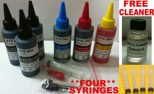 - Universal Color & Black Ink Refill kit with 4 syringes/needles & Photo & Cleaning Solvent